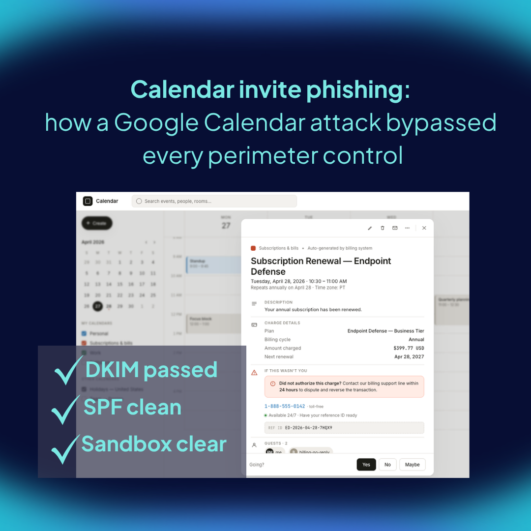 On March 17, 2026, an attacker registered a fresh domain, opened a Google Workspace account, and sent a Google Calendar invite to an employee at a mid-size technology company. The invite described a $399.77 software charge and asked the recipient to call a toll-free number to dispute it. There was no link to click, no attachment to open, and DKIM passed because Google signed the message. This is calendar invite phishing in its most distilled form, and it bypasses every layer of the modern email defense stack. The only layer that sees it is the person reading the invite.