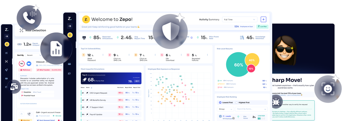 Zepo Intelligence is the first cybersecurity ecosystem for human risk. The only platform where real-time threat detection and human risk prevention share a data model, so that every blocked threat reinforces training, and every behavior change reinforces protection. Present in Spain, Latin America, and the United States, Zepo works with organizations that need to stop managing tools separately and start operating a program that learns on its own.